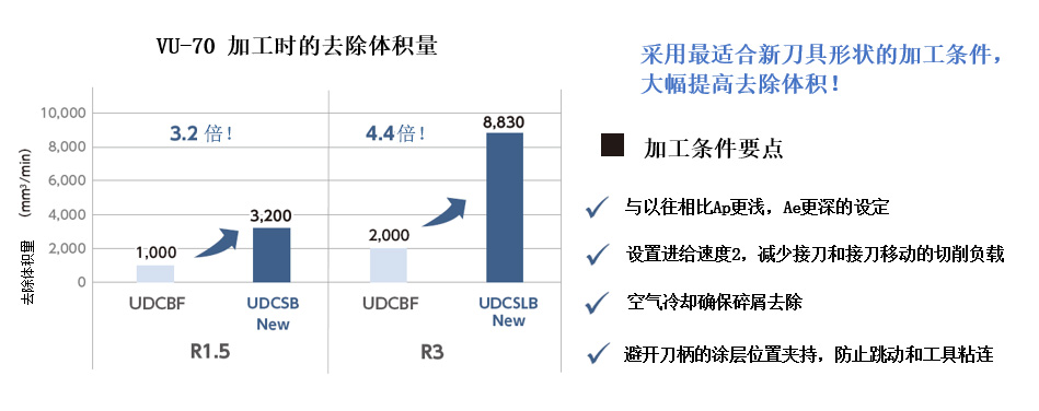 UDC-H系列是、同F系列不同的刃尖处理,改良的金刚石涂层,实现了难以想象的硬质合金高效率直接加工,大大提高了除去体积效率,适合从开粗到中精加工,值得期待的UDC第三代系列产品。 与之前发售的F 系列一起使用的话,可以高效率高质量地进行超硬合金的直接切削。