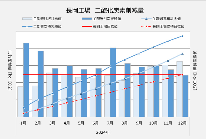 電気使用量の削減・効率化により長岡工場では前年度排出量の1.95%に相当する二酸化炭素排出量を削減し、見附工場では2.50%に相当する二酸化炭素排出量を削減し、共に目標を達成することが出来ました。